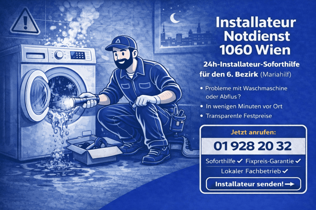 Kurzfassung: Der Installateur Notdienst 1060 Wien Mariahilf ist rasch bei Ihnen – ob rund um die Mariahilfer Straße, beim Haus des Meeres oder nahe Naschmarkt. Bei Rohrbruch, verstopftem Abfluss oder Heizungsausfall sind wir 24 Stunden erreichbar und schnell im Bezirk Mariahilf im Einsatz. Jetzt sofort anrufen unter 01 928 1208 – wir beheben den Schaden zuverlässig und sauber.